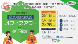 3月のオフィスアワーは、5日、11日、19日、26日に開催します!今回のオフィスアワーは産業雇用安定センターと愛知県プロフェッショナル人材戦略拠点と共催により、「求人・CxO人材」強化月間として、求人に関する相談やCxO人材の相談を行います。