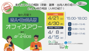 4月のオフィスアワーは、8日、15日、21日、30日に開催します!21日と30日は人材相談として産業雇用安定センターと愛知県プロフェッショナル人材戦略拠点と共催により、「求人・CxO人材」強化月間として、求人に関する相談やCxO人材の相談を行います。8日と15日は通常のオフィスアワーとなります。