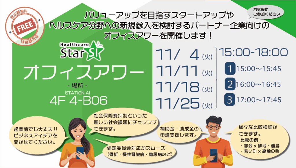 各日15時からとなりますので、自社のバリューアップを目指すスタートアップさんや、ヘルスケア分野への新規参入をご検討のパートナー企業様など、お気軽にご参加ください。