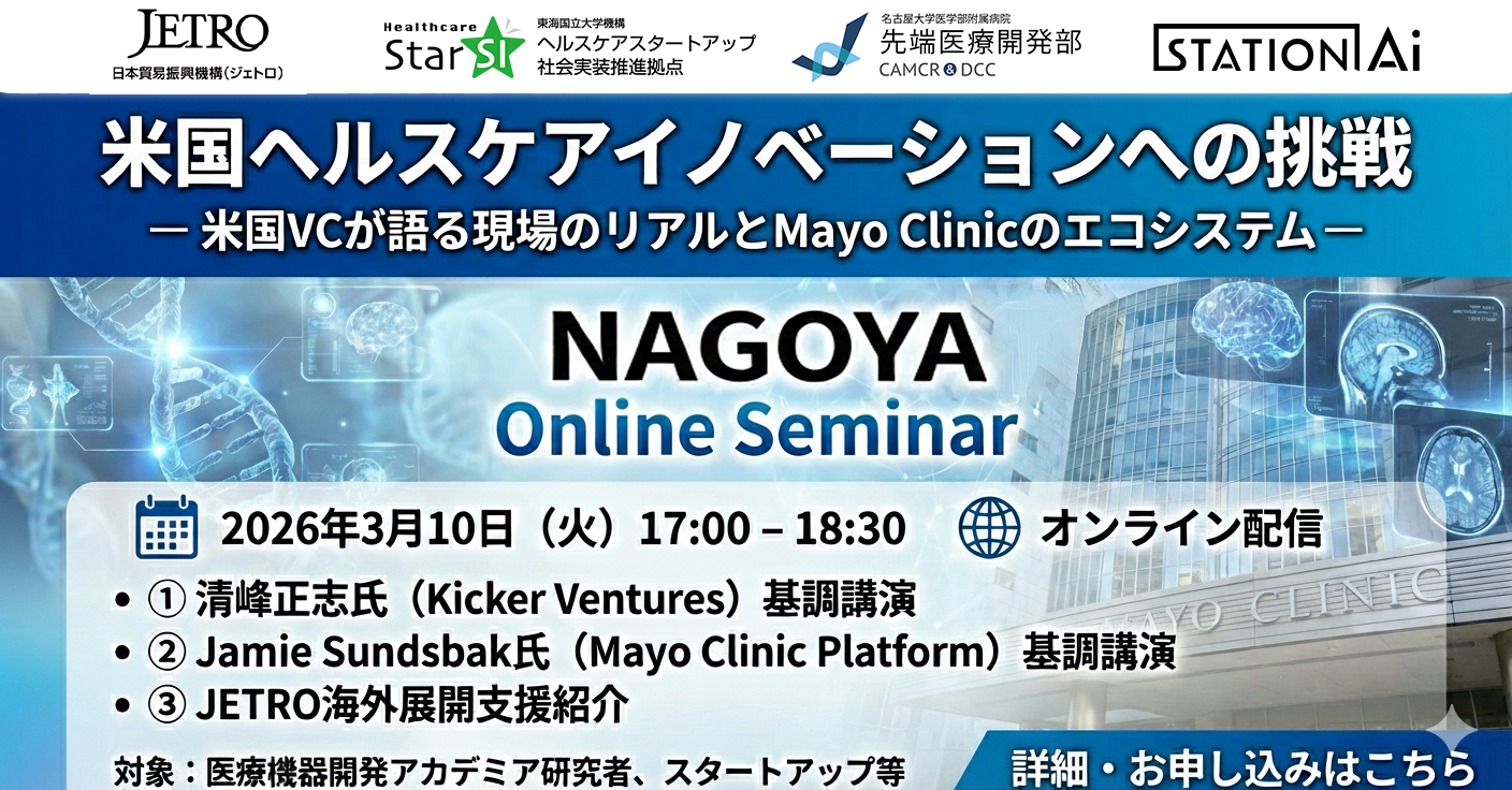 Mayo ClinicグループおよびKicker Venturesと連携したスタートアップ海外展開支援プログラムJ-StarX AI Medicalコースの事例をもとに、Kicker Venturesの清峰正志様などから「米国ヘルスケアイノベーションへの挑戦 ― 米国VCが語る現場のリアルとMayo Clinicのエコシステム―」をテーマに、医療機器開発を担うアカデミアの研究者やスタートアップを対象にしたセミナーを開催します。グローバルマインドの醸成とヘルスケアスタートアップ創出促進を加速するセミナーです。